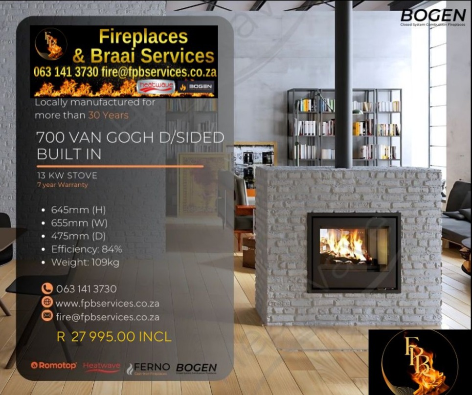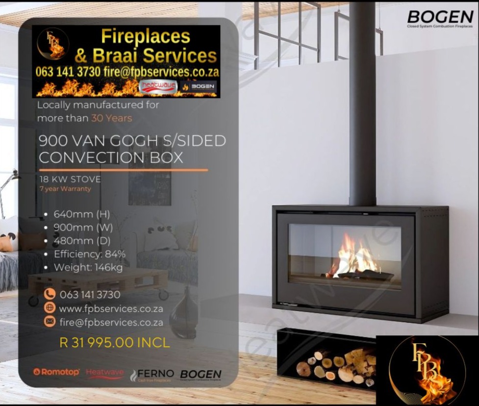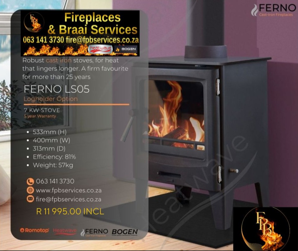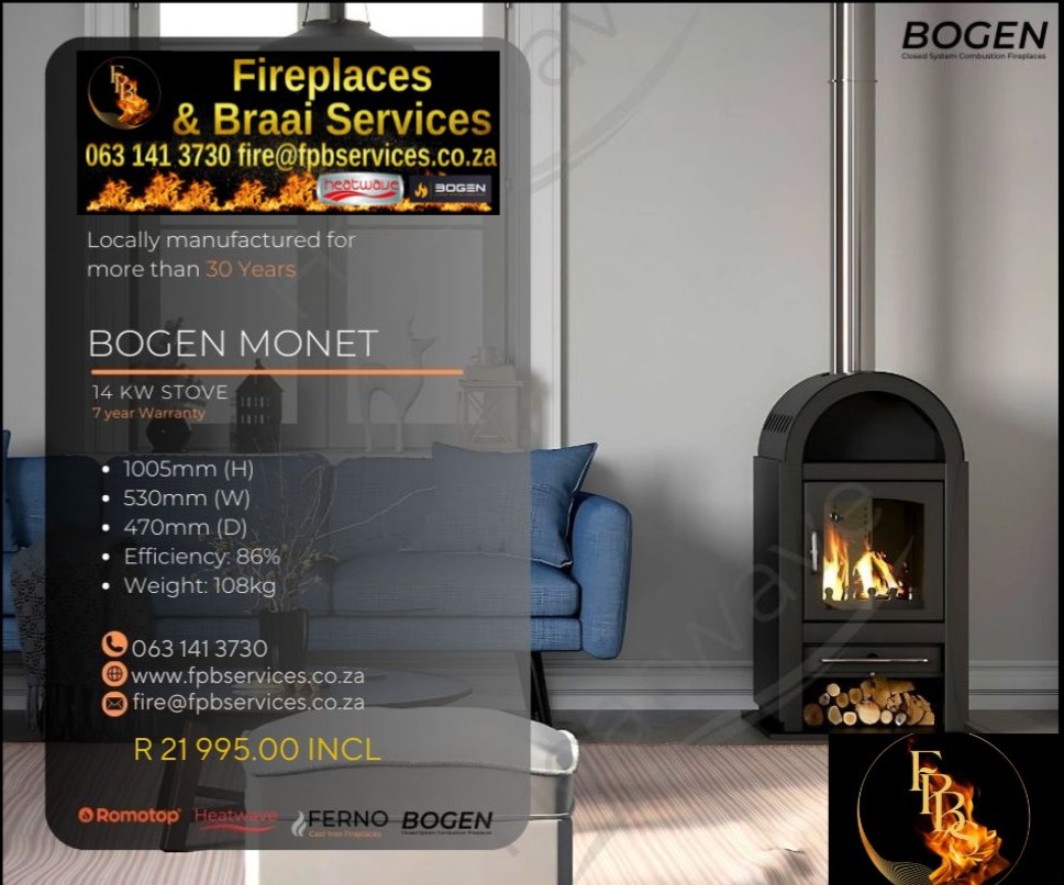 Stromboli (Rotating) – Freestanding From R51745.00 (Ceramic Options) From 12 – 14Kw (up to 140m2 in 10mx14m room with normal Ceiling Height) TALA – FreestandingFrom R27995.00From 9 – 10Kw (up to 100m2 in 10mx10m room with normal Ceiling Height) Evora (Rotating) – Freestanding From R33995.00 From 8 – 10Kw (up to 100m2 in 10mx10m room with normal Ceiling Height) Glass Side Framed Fireplaces: SAPPHIRE / AMETHYST / CRYSTAL / EMERALD & TOPAZĀ From R13650.00Heating Capacity is limited to open flames and volume of room BOGEN FIREPLACES FERNO CAST IRON FIREPLACES